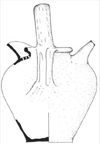 Cruche 5Récipient muni d’au moins une anse surmontée d’un poucier ; l’existence d’un bec tubulaire est encore hypothétique car aucune forme totalement complète de ce type n’a été mis au jour actuellement.