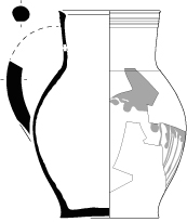 Pichet 2-1Pichet présentant une panse à profil surbaissé, reposant sur un fond plat. Col concave ornée de stries horizontales externes. Lèvre verticale courte à moulure externe. Aménagement d'un bec pincé opposé à l'anse plate à sillon externe.