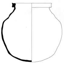 Pot 1-1 | Récipient globulaire avec une panse développée et un col pratiquement inexistant. Il est muni d’un rebord à inflexion externe plus ou moins rectangulaire et parfois d’une légère gorge sommitale. Datation : forme plutôt du haut Moyen-Age |  |
