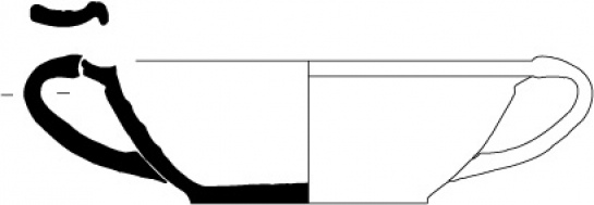 Pot 12-4Récipient de taille moyenne à une anse se rattachant sur une lèvre déjetée avec un bourrelet externe. Il possède une base tripode.
