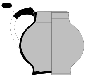 Pichet 5Récipient globulaire avec un haut col droit ou concave souvent marqué de cannelures. Il possède des pieds et une anse ronde attachée sur le col. La liaison panse-fond est peu marquée. Le rapport hauteur / largeur est égal ou proche de 1. Le col représente ¼ ou 1/3 de la hauteur.
