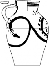Récipient à base concave ou horizontale, panse évasée et encolure éversée, muni d’une anse verticale rubanée dont les points de fixation supérieur et inférieur s’inscrivent respectivement sur la lèvre et sur la panse. La base de la panse est saillante. Dimensions : hauteur totale : de 69 à 81 mm ; diamètre de la base : 90 mm ; diamètre de l’ouverture : 210 mm.