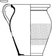 Jatte ansée 6Récipient représenté par un individu à base concave, panse courbe et encolure verticale, muni d’une anse verticale torsadée en forme de serpent, dont les points de fixation supérieur et inférieur s’inscrivent respectivement sur la lèvre et sur la base de la panse. La jonction entre l’encolure et le corps du récipient est soulignée par un cordon horizontal. La base de la panse est marquée par une inflexion interne. Dimensions : hauteur totale : 86 mm ; diamètre de la base : 126 mm ; diamètre de l’ouverture : 174 mm.