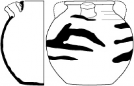 Lèchefrite 1Grand récipient de forme approximativement ovale, à base concave, paroi verticale ou légèrement évasée, muni d’un bec pincé et deux anses annulaires fixées à l’horizontale. Dimensions : hauteur totale : de 35 à 40 mm ; largeur : 60 mm (1 individu) ; longueur estimée : environ 390 mm.
