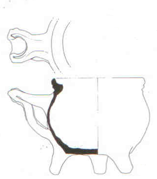 Réchauffoir et Réchaud de table à panse rectiligne ; un manche horizontal, creux tourné, et trois anses verticales, faisant office de tenons, fixées sur le bord et la panse.