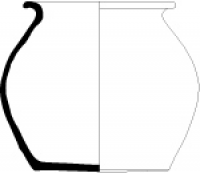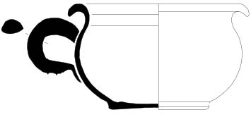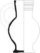 Récipient à panse ovoïde plus élancée, col développé, bec pincé, anse rubanée reliant le col et le diamètre maximal de panse, pied tronconique.