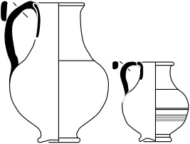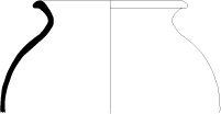 Récipient globulaire, embouchure pincée, col marqué, anse rubanée reliant la lèvre à la panse, fond bombé.