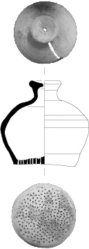 Pichet 2-3Récipient d'une quarantaine de centimètre de haut, de forme globulaire à col resserré,à lèvre rentrante et à une anse.
