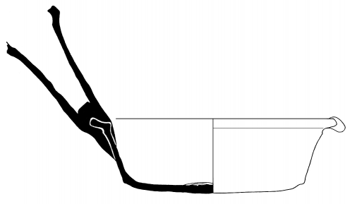 Biberon 1-1Récipient à lèvre évasée arrondie, bec tubulaire, anse ronde latérale, panse globulaire, fond plat débordant.