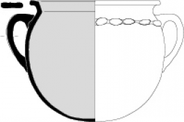Pichet 1-2Récipient avec bord à lèvre évasée à gorge interne, col évasé, une anse rubanée, panse ovoïde, fond plat débordant.