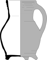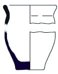 Chope 1Récipient cylindrique en grès rhénan avec une lèvre épaissie et rentrante et un fond légèrement concave. L'anse est ovale et rattachée sous la lèvre.