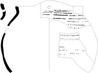Pot 8-4profil ramassé, bord élancé éversé muni d’une anse, lèvre biseautée, panse globulaire, base munie de pieds à extrémité repliée