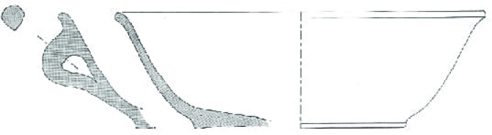 rattache l’anse et d’un fond bombé. Datation : XVIe - XVIIe Lieu de découverte : Chalon-sur-Saône, Hôtel de Ville Département : 71 |  |