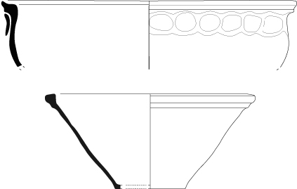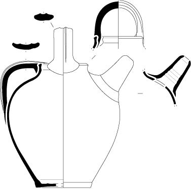 Pichet 5-2Vase à panse ovoïde prolongée par un col légèrement évasé et une lèvre à méplat sommital. Un bec verseur est aménagé par pincement de la lèvre et l'attache de l'anse plate se situe juste sous la lèvre.