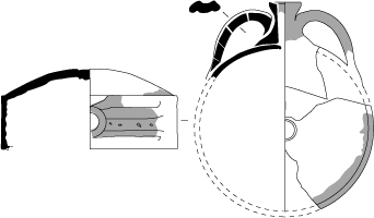 Gourde en forme de tambourin à face bombée. Diamètre maximal de la panse en forme d'anneau large sur lequel est aménagé le goulot cylindrique jouxté de deux anses plates assez longues.